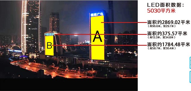 媒體規(guī)格:合計5030平方米(A樓外立面約2869.02㎡, B樓外立面約1784.48㎡,B樓內(nèi)透屏約375.57㎡)