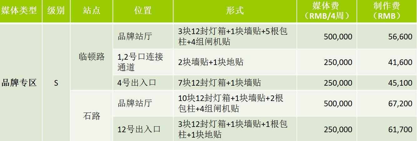 | S級(jí):1、2號(hào)線換乘站——廣濟(jì)南路 1、2號(hào)線換乘區(qū):8根包柱+換乘區(qū)4塊12封燈箱+1塊墻貼 媒體費(fèi)(RMB/4周)720,000;制作費(fèi):90,500 1、2號(hào)線換乘通道:6塊梯側(cè)貼+1塊梯頂 媒體費(fèi)(RMB/4周)580,000;制作費(fèi):53,300 品牌站廳:3塊12封燈箱+8根包柱+5組閘機(jī)貼 媒體費(fèi)(RMB/4周):380,000制作費(fèi):62,700 1、2號(hào)線換乘站臺(tái):12根包柱+3塊墻貼+20面吊旗 媒體費(fèi)(RMB/4周):500,000制作費(fèi):86,300 |