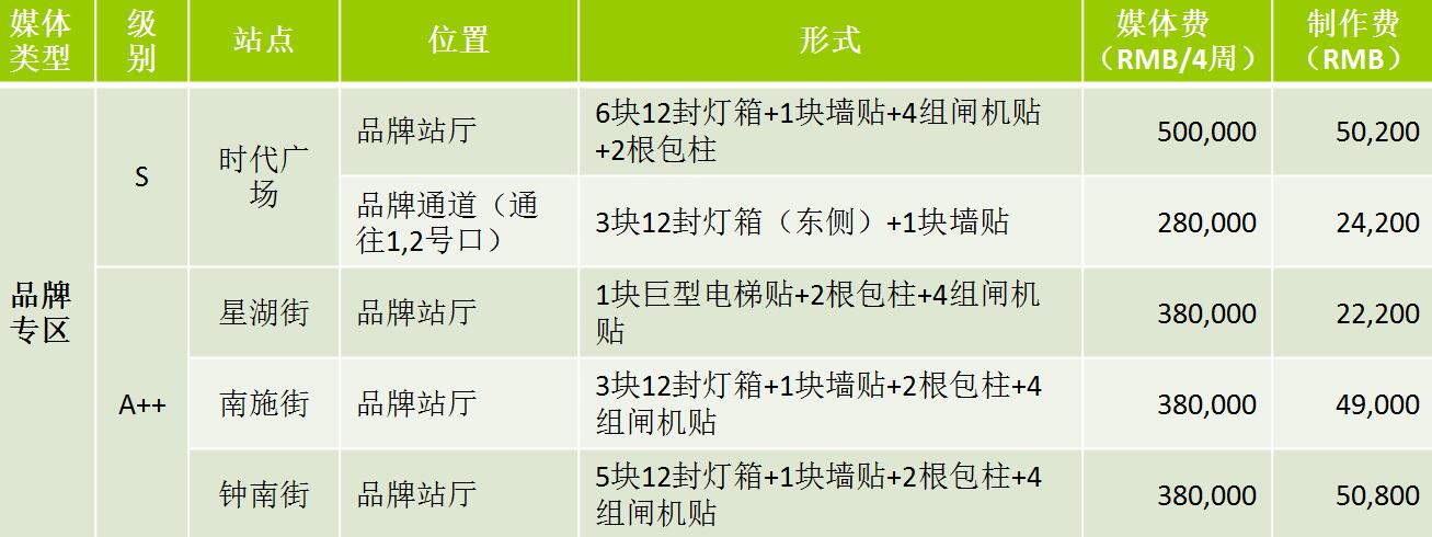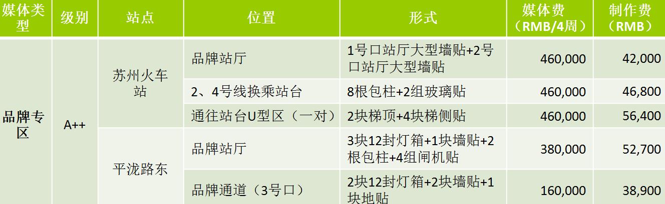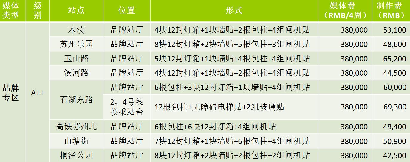 | 蘇州地鐵12封燈箱 級(jí)別 S:媒體費(fèi)(RMB/4周/站) 72,000元 A++:媒體費(fèi)(RMB/4周/站)58000元 A+:媒體費(fèi)(RMB/4周/站)35000元 A:媒體費(fèi)(RMB/4周/站)28000元 制作費(fèi):950元 ? |