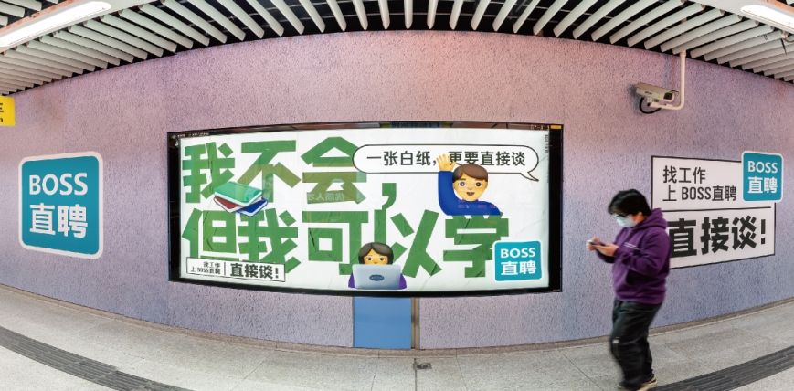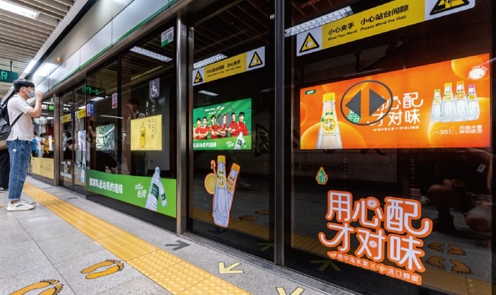 主要分布在不同線路站廳換乘的通道內,覆蓋雙線客流密集的換乘區域,墻貼+燈箱的媒體組合拳加速品牌代入感,形成獨立的超級品牌空間,