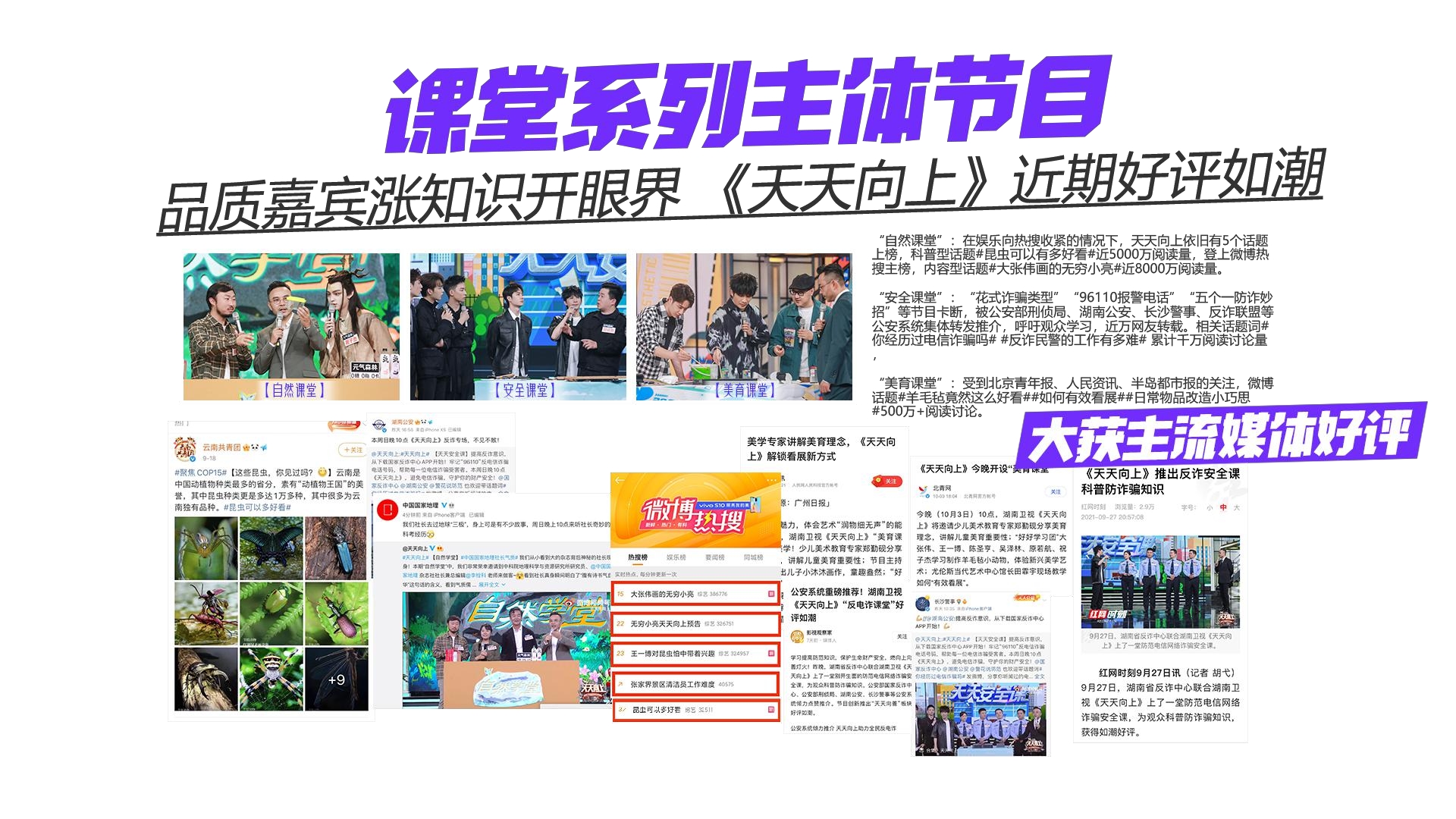 《天天向上》由湖南經(jīng)視《越策越開心》原班人馬打造。兼有“策”的神韻, 更有發(fā)揚(yáng)中華美德的社會責(zé)任。