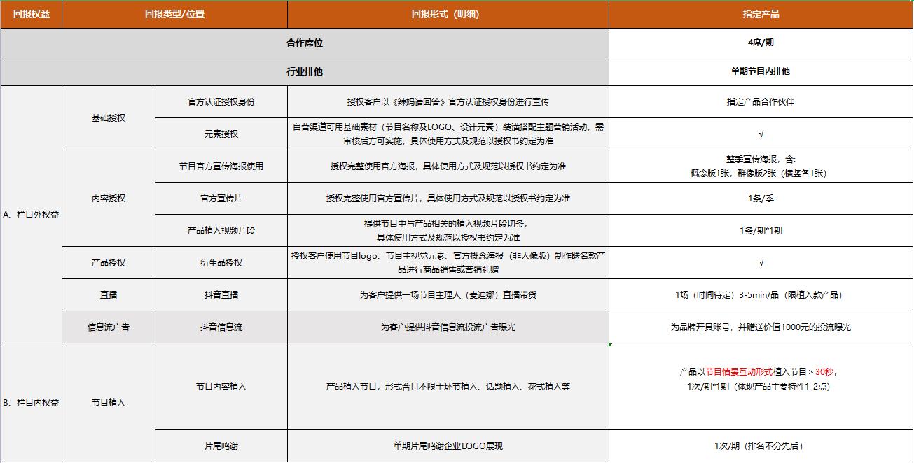 《星媽請回答》指定產(chǎn)品權(quán)益表