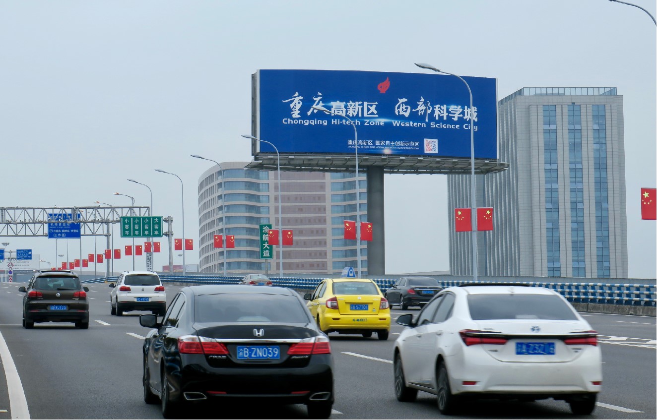 T3航站樓進場路第一塊高立柱,地標性媒體 ?主城、渝鄰高速、第一機場大道三條通道匯集。