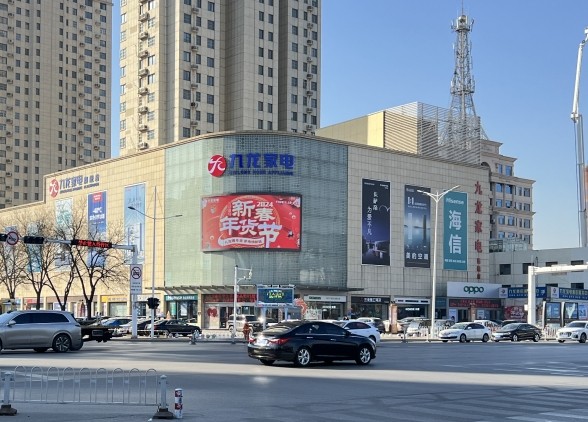 大屏位于濟(jì)寧金宇路與琵琶山路交匯處西南角九龍家電商城樓體,處于濟(jì)寧市第二商圈位置,周邊有紅星美凱龍、永旺購物中心、貴和商城、金宇家具等商場。