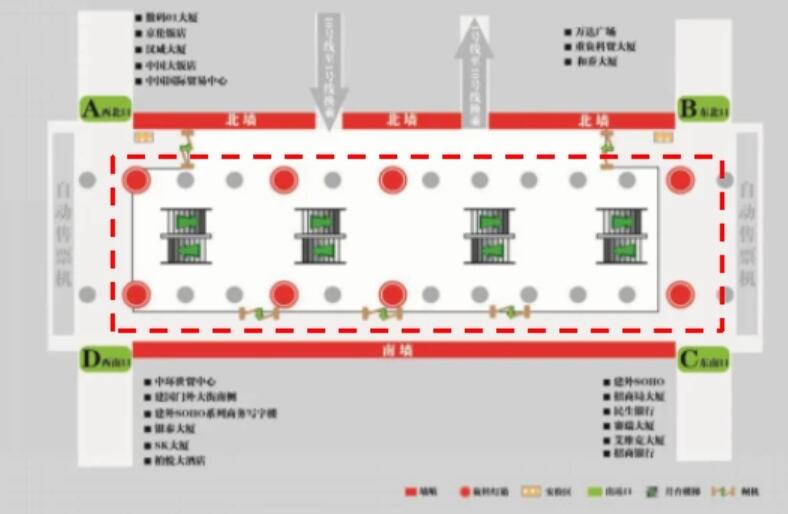 2、站廳西北側A出口:中國大飯店、中國國際貿易中心、國貿商城、國貿飯店、國貿公寓、中海廣場寫字樓