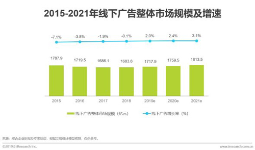 中國線下廣告因受到互聯網沖擊,整體規模在2015-2018年間呈現負增長趨勢,從1787.9億元跌落到1683.8億元。預計從2019年起,線下廣告整體規模將從負增長回復至正增長,且增長率將逐年提升。