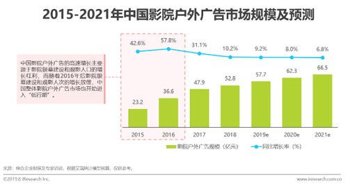 根據艾瑞咨詢數據顯示,2018年中國影院戶外廣告市場規模達52.8億元,同比增長率為10.2%。中國影院戶外廣告市場將逐漸進入增長放緩的“低行期”。隨著院線的收縮與整合,以及影院建設的結構調整,未來一線城市頭部影院銀幕資源將愈發稀缺,影院戶外媒體公司競爭壓力變大。一方面,頭部影院資源將成為戶外媒體公司的核心競爭壁壘,另一方面,四五線城市將為影院廣告市場提供更多新的發展機會。