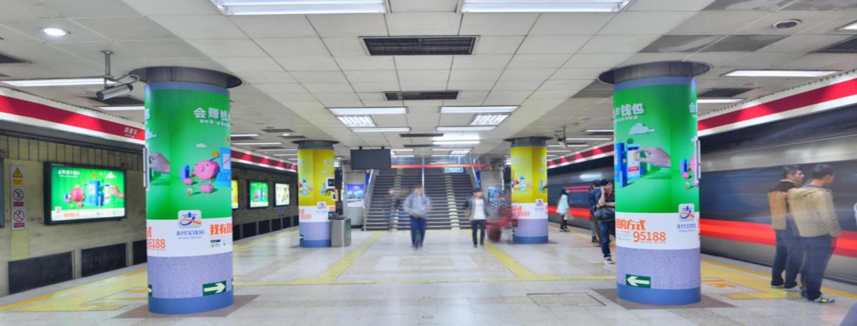 媒體優(yōu)勢與運(yùn)用: 大望路位于CBD核心地帶,是地鐵1號(hào)線和14號(hào)線的換乘站,人流量大,周邊聚集大量金融機(jī)構(gòu)和寫字樓等。8根包柱分布在整個(gè)站廳,可以有效覆蓋站廳客流。