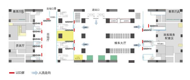 分      布:  高鐵站內候車廳、檢票口、安檢口、進出口、售票廳、扶梯口及站臺等重要關口