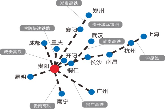 南面貴廣高鐵直接連通珠三角、北部灣,東面滬昆高鐵連通華中和長三角,西面滬昆高鐵連接云南省,北面渝黔鐵路以及成貴高鐵連通重慶市和四川省。