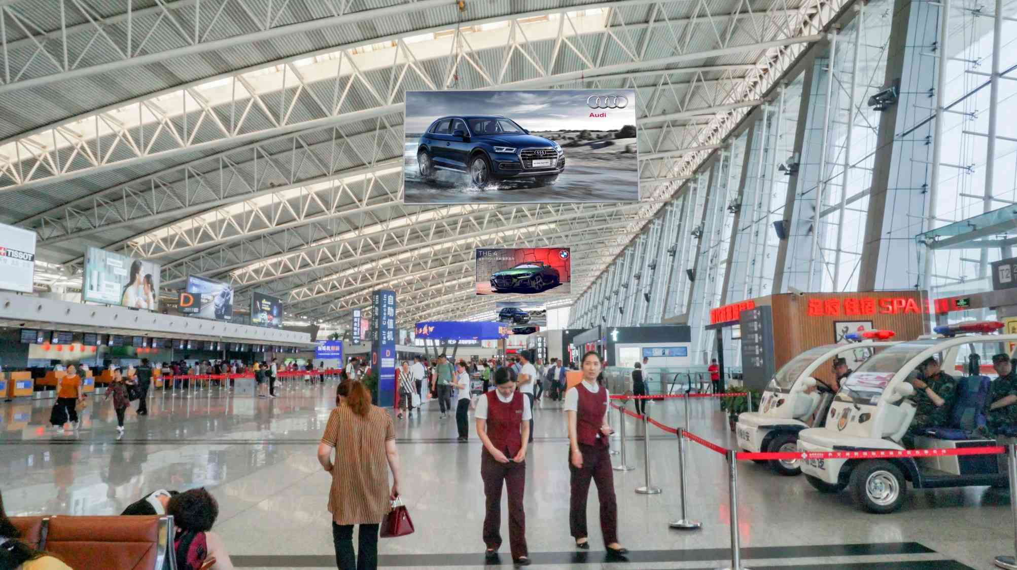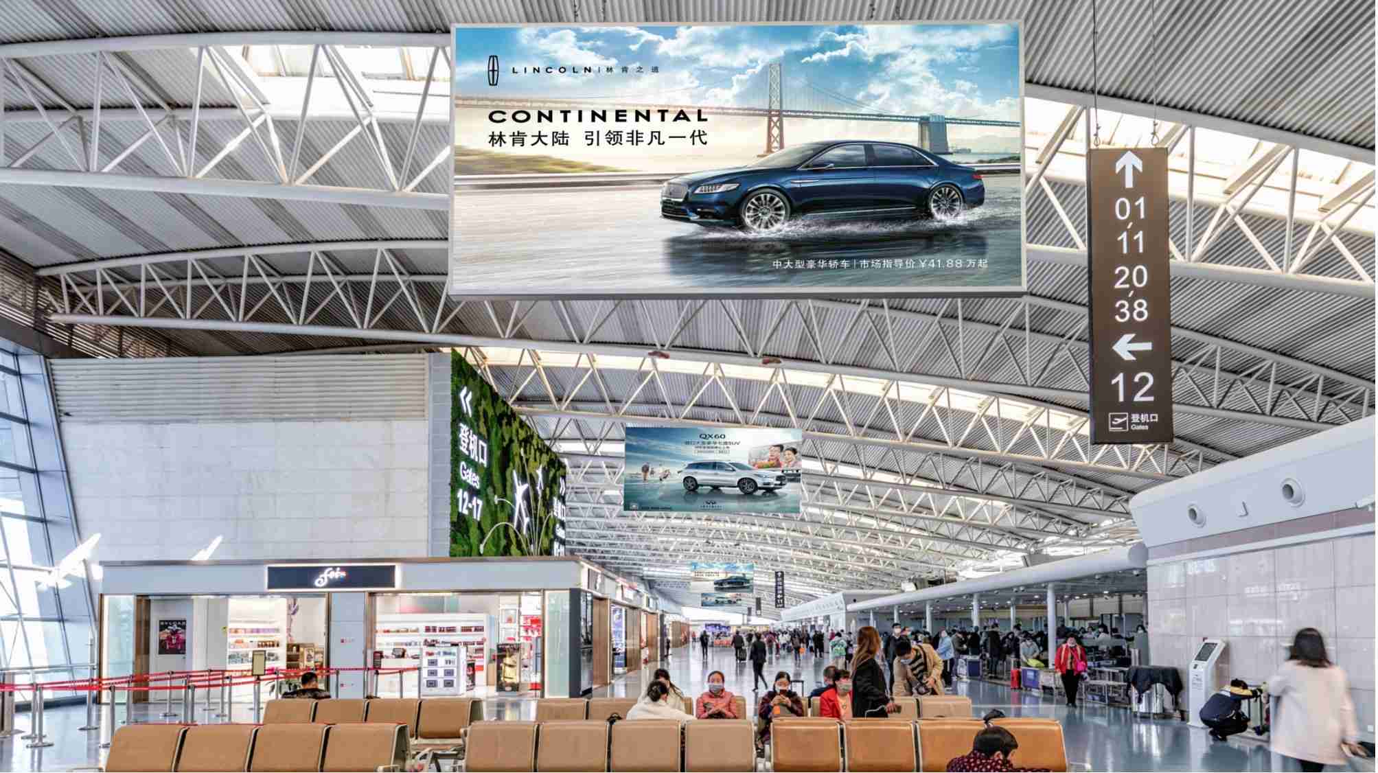 西安咸陽(yáng)機(jī)場(chǎng)T2航站樓國(guó)內(nèi)出發(fā)懸掛燈箱廣告,萬事成傳媒