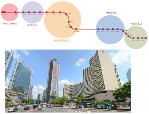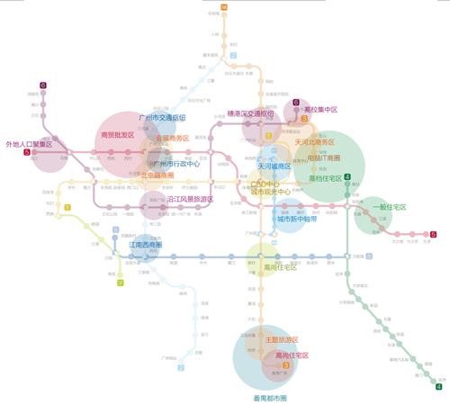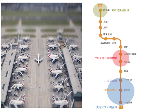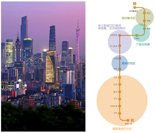 3號線 ——高端CBD線:3號線與1號線、3北線、5號線、8號線及APM線同時接軌,連接了廣州最高端的商務區(珠江新城)、最繁華的商業區(天河城)、最高檔的住宅區、最高密度的IT數碼商圈(崗頂)、以及廣州多個重點院校(華工、華師和華農),匯集了高密度的高端素質客流。