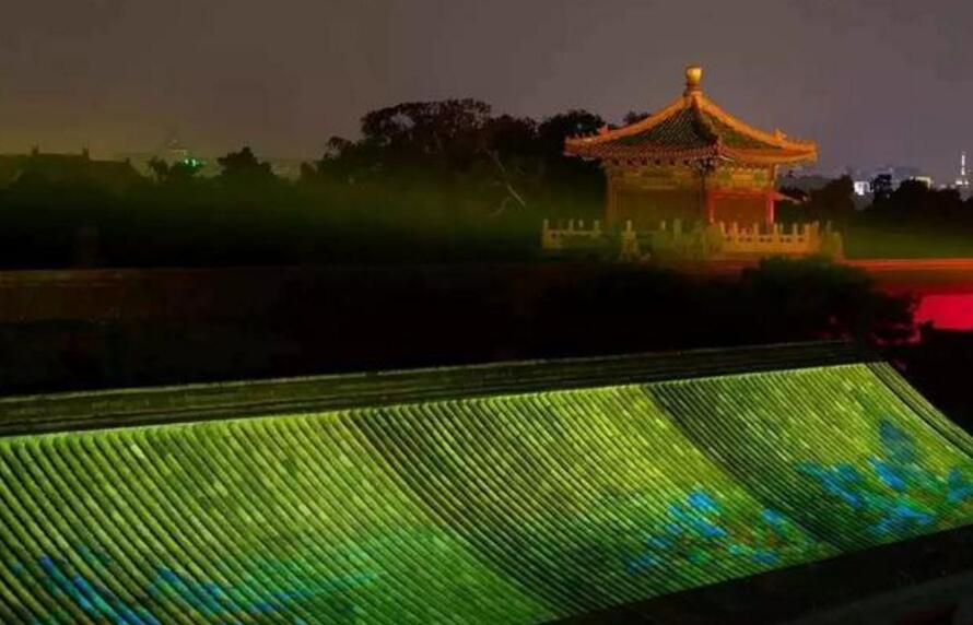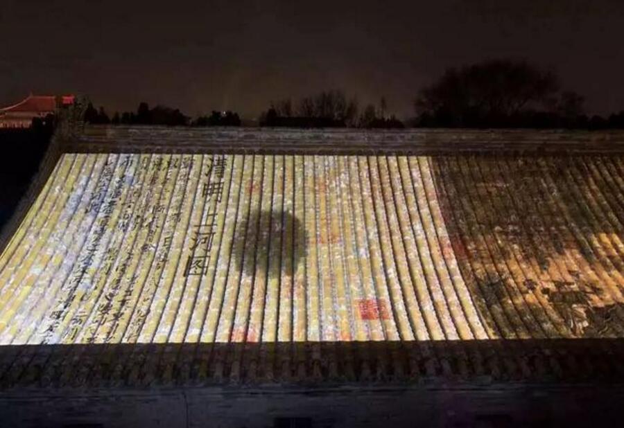 此次夜游故宮最精彩的地方,莫過于從東北角樓帶神武門的這一塊區域了。光與影將《清明上河圖》和《千里江山圖》等畫卷投影于大殿屋頂上,或如展開的折扇,或如綠色的屏障,耳邊還應景地回蕩著叫賣、搖櫓等聲音,古畫的意境與屋瓦融為一體,靈動異常,仿佛人在畫中游。