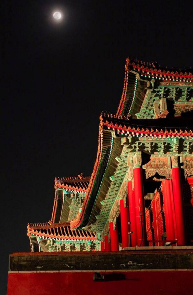比起午門的瑰麗,太和門廣場顯得較為古樸。重檐之上的月光,城墻下延綿的彩燈,似乎將四周的宮殿剛剛喚醒,斑駁與浮華交織,偶有御貓從屋脊輕盈地掠過。