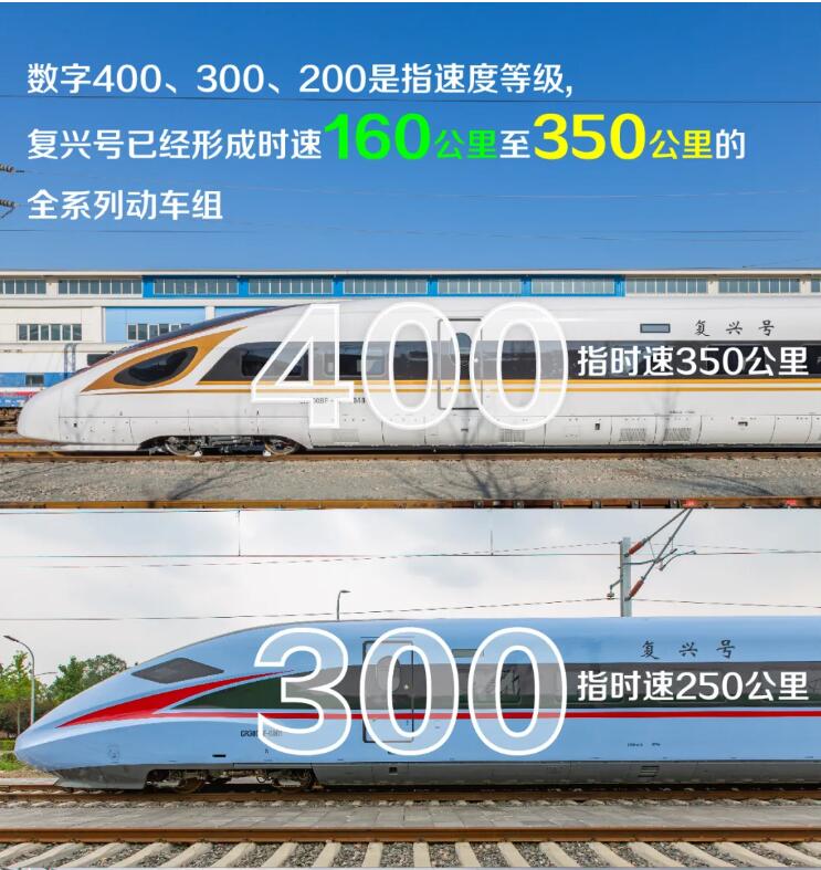 復興號已經系列化,速度等級覆蓋時速160公里至350公里,牽引動力包括動力分散動力集中式,編組包括8至17輛多種編組型式,可適應零下40攝氏度高寒地區等各種運用環境