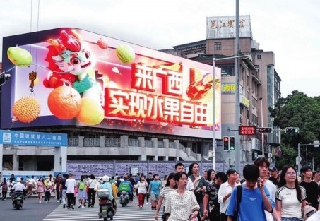 “來廣西實現(xiàn)水果自由”的宣傳片出現(xiàn)在中山路裸眼3D廣告大屏上,鮮活生動。